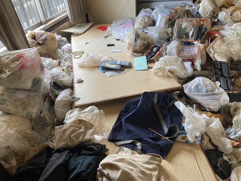 部屋の中はゴミ袋や食品容器が散乱し、机の上や床一面が埋め尽くされた状態でした。害虫の発生や悪臭もあり、住人の方は「どこから手を付けていいのか分からない」と困り果てていました。